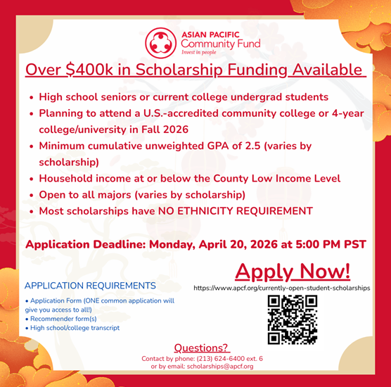 The Asian Pacific Community Fund is pleased to remind you that our 2026 scholarship applications are now open. Over $400,000 in scholarship funding is available to support students in their pursuit of higher education.